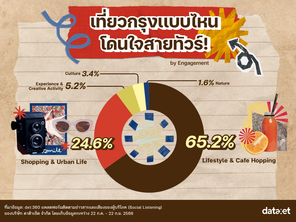 การท่องเที่ยวเชิงไลฟ์สไตล์กำลังมาแรงในหมู่ Gen Z และ Millennial ที่มองหาประสบการณ์เที่ยวกรุงแบบ “มีสไตล์” คอนเทนต์สาย Aesthetic อย่างคาเฟ่ฮอปปิ้ง ร้านขนมเก๋ ๆ สถานที่หรือมุมถ่ายรูปสวย (Instagrammable) ที่เหมาะแก่การแชร์ลงโซเชียล กำลังได้รับความนิยมอย่างมาก โดยเฉพาะบน TikTok และ Instagram ที่ตอบโจทย์ทั้งการพักผ่อน การถ่ายคอนเทนต์ และการใช้โซเชียลมีเดียเป็นพื้นที่แสดงตัวตนของคนรุ่นใหม่