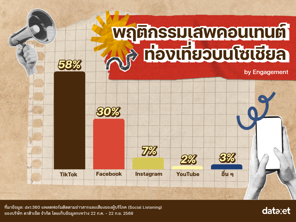 บริษัท ดาต้าเซ็ต จำกัด ได้รวบรวมข้อมูลจากโซเชียลมีเดียผ่านเครื่องมือ dxt:360 ระหว่างวันที่ 22 กรกฎาคม – 22 กันยายน 2568 เพื่อติดตามความคิดเห็นในสังคมออนไลน์ (Social Listening) เกี่ยวกับความสนใจการท่องเที่ยวในกรุงเทพมหานคร