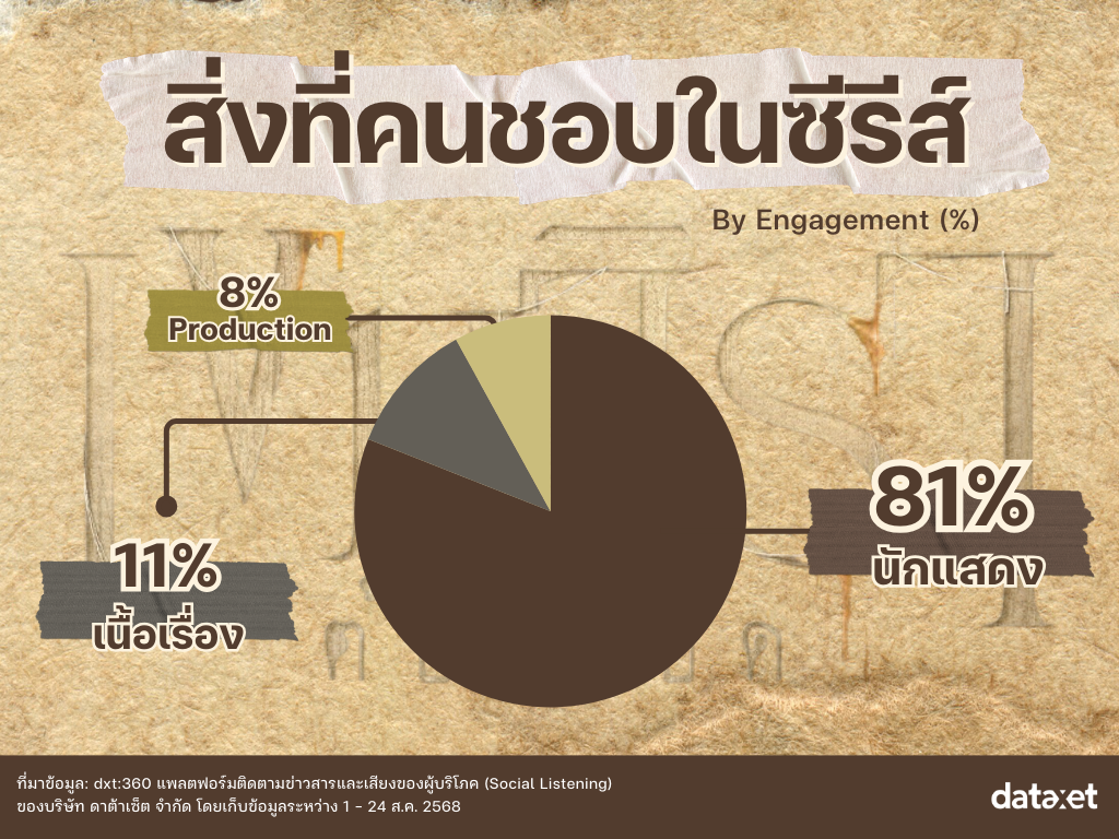 สุดท้าย คือประเด็น “Production” ได้รับ Engagement 8% แม้จะไม่ใช่ประเด็นหลัก แต่ก็ถือเป็นรายละเอียดที่ช่วยเสริมให้ซีรีส์ถูกมองว่าน่าสนใจมากยิ่งขึ้น สิ่งที่ผู้ชมชื่นชมคือ การจัดแสง บรรยากาศในเรื่องที่ช่วยถ่ายทอดออกมาได้สมจริง จนทำให้ผู้ชมรู้สึกอินไปกับเนื้อเรื่อง นอกจากนี้ สถานที่และฉากถ่ายทำ ก็ถูกออกแบบให้มีความสมจริงและสอดคล้องกับเรื่องราวที่เล่า รวมถึงเรื่องการแต่งกายของนักแสดง ที่เหมาะสมกับบทบาท โดยสิ่งเหล่านี้แม้จะเป็นองค์ประกอบเล็ก ๆ แต่ทำให้ซีรีส์เรื่องนี้ถูกมองว่าใส่ใจทุกรายละเอียด