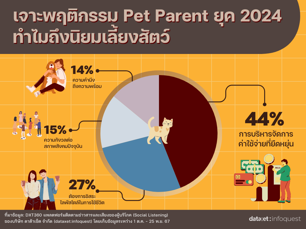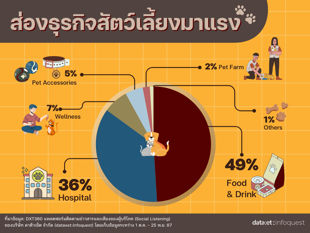 กระแสการเลี้ยงสัตว์เหมือนลูก หรือ Pet Parent ได้เข้ามามีอิทธิพลต่อการเติบโตของธุรกิจสัตว์เลี้ยงอย่างชัดเจน จากข้อมูลพบว่าผู้คนในสังคมออนไลน์มีการกล่าวถึงธุรกิจอาหารและขนม (Food & Snack) มากที่สุดถึง 49% รองลงมาคือธุรกิจโรงพยาบาล (Hospital) 36% ธุรกิจดูแลสุขภาพ (Wellness) 7% ธุรกิจอุปกรณ์เสริมสำหรับสัตว์เลี้ยง (Pet Accessories) 5% ธุรกิจฟาร์มสัตว์ (Pet Farm) 2% และอื่น ๆ อีก 1% สะท้อนให้เห็นว่าคนยุคใหม่พร้อมลงทุนเพื่อคุณภาพชีวิตที่ดีของสัตว์เลี้ยง