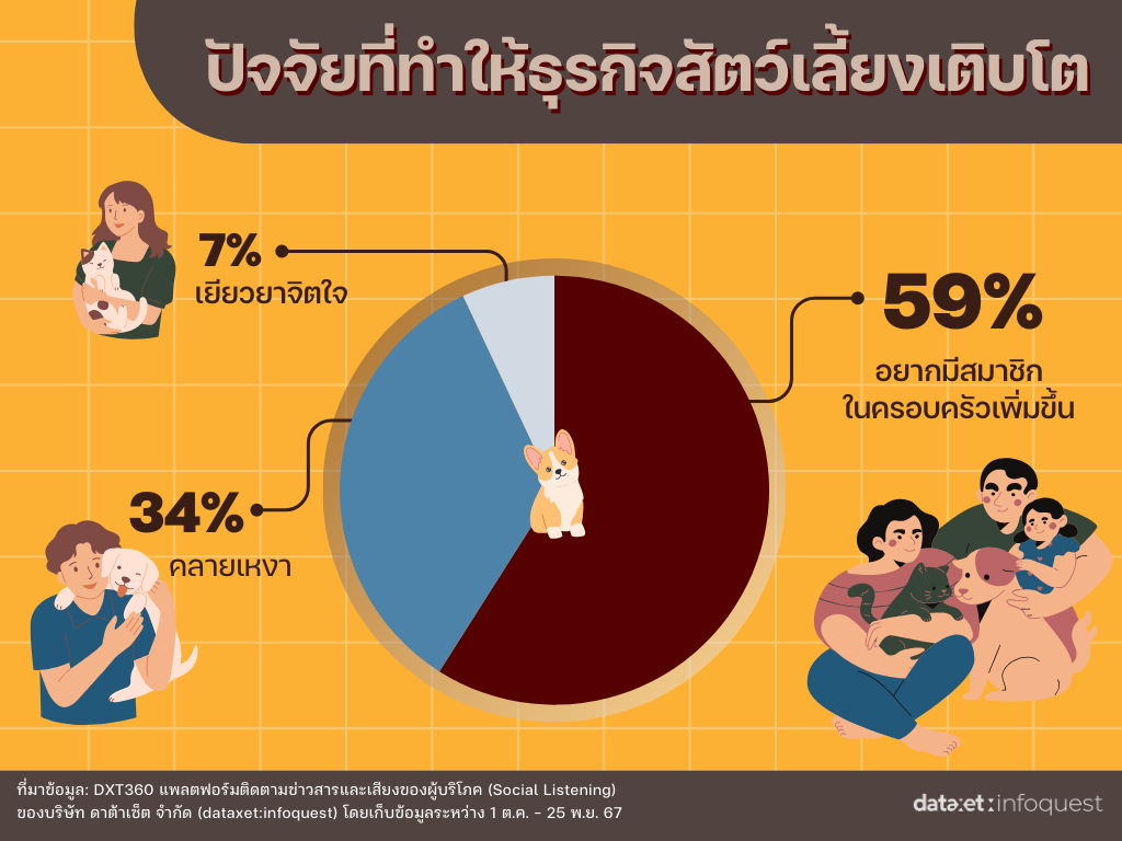 สำรวจจากพฤติกรรมผู้ใช้ Social Media พบว่าไลฟ์สไตล์ของคนยุคนี้ นิยมเลี้ยงสัตว์เหมือนลูก (Pet Parent) ส่งผลให้ตลาดสัตว์เลี้ยงเติบโตอย่างก้าวกระโดดจากหลายปัจจัย การเพิ่มขึ้นของครอบครัวเดี่ยวและคนโสด ประกอบกับแนวโน้มการมีลูกน้อยลง ส่งผลให้ผู้คนมองหาสัตว์เลี้ยงมาเติมเต็มชีวิต โดยพบว่าผู้ใช้โซเชียลมีเดียส่วนใหญ่อยากมีสมาชิกในครอบครัวเพิ่มขึ้น 59% เลี้ยงเพื่อคลายเหงา 34% และช่วยเยียวยาจิตใจจากความเครียด 7% ส่งผลให้ผู้คนหันมาเลี้ยงสัตว์เพิ่มมากขึ้นในช่วงเวลาที่ผ่านมา