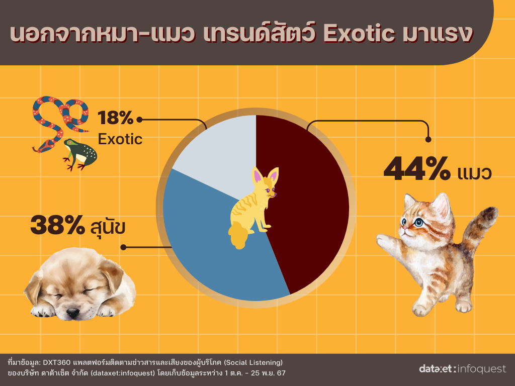 จากการรวบรวมโพสต์และความคิดเห็นบน Social Media สามารถแบ่งประเภทของสัตว์เลี้ยงได้เป็น 3 ประเภทหลัก ๆ นั่นก็คือ “แมว” ที่ครองสัดส่วนมากที่สุดถึง 44% สะท้อนไลฟ์สไตล์คนเมืองที่มักอาศัยอยู่ในพื้นที่จำกัดอย่างคอนโด รองลงมาคือ “หมา” มีสัดส่วนการกล่าวถึง 38% ซึ่งคนเลี้ยงส่วนใหญ่มักจะเลี้ยงในพื้นที่กว้างและต้องการมีกิจกรรมร่วมกัน และลำดับสุดท้ายคือ “สัตว์เลี้ยง Exotic” มีการกล่าวถึง 18% ซึ่งการเลี้ยงสัตว์แปลกประเภทนี้มีแนวโน้มเพิ่มขึ้นเรื่อย ๆ จากเมื่อก่อน