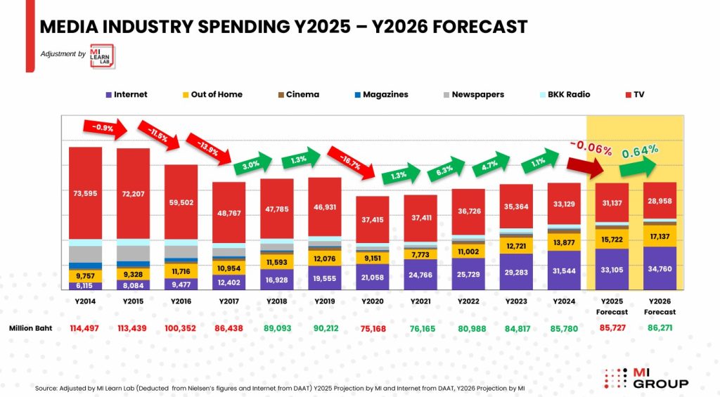 สำหรับภาพรวมทั้งปี 2568 MI GROUP คาดว่าเม็ดเงินโฆษณาทีวีจะอยู่ที่ 31,137 ล้านบาท และจะลดลงเหลือ 28,958 ล้านบาทในปี 2569 เพราะต้องรับมือกับภาวะเศรษฐกิจไทยที่โตช้า โดยคาดว่าจีดีพีจะขยายตัวเพียง 1.6-2.0% ซึ่งต่ำกว่าค่าเฉลี่ยโลกและรั้งท้ายกลุ่มอาเซียน ปัจจัยลบเหล่านี้ส่งผลกระทบโดยตรงต่อการตัดสินใจใช้งบโฆษณาของภาคธุรกิจ
