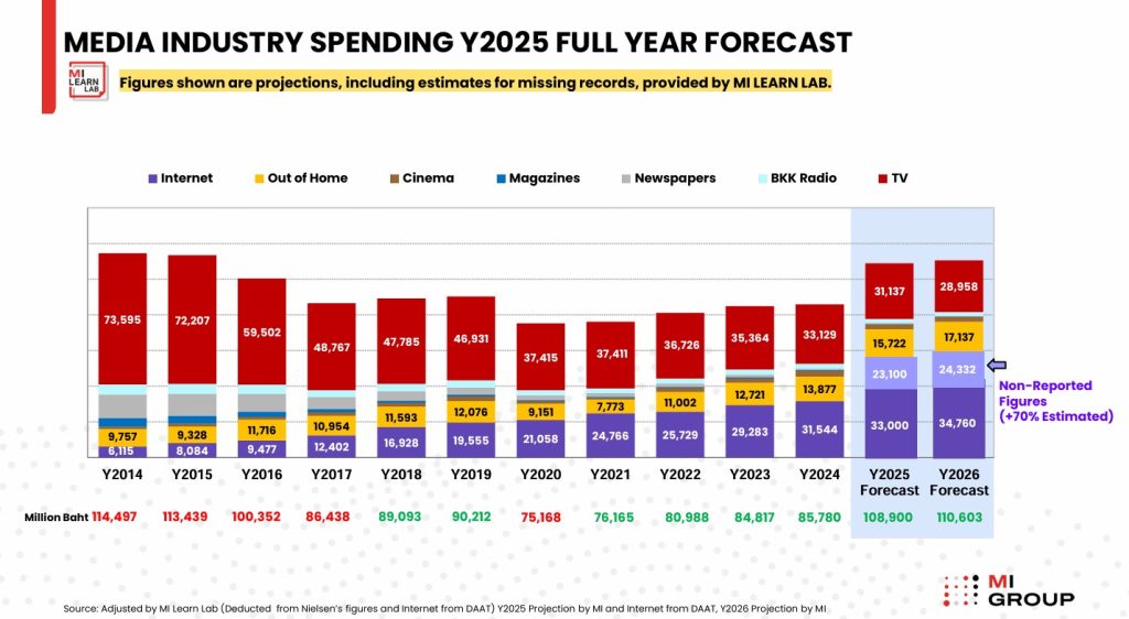 โดย MI GROUP คาดการณ์ว่าในปี 2569 จะมีเม็ดเงินนอกระบบการสำรวจเดิมสูงถึง 24,332 ล้านบาท หากรวมยอดดังกล่าวเข้ากับเม็ดเงินในระบบ อุตสาหกรรมโฆษณาในปี 2569 จะมีมูลค่ารวมสูงถึง 1.1 แสนล้านบาท ซึ่งสื่อดิจิทัลและอินฟลูเอนเซอร์จะครองส่วนแบ่งตลาดเกินกว่า 53% สะท้อนให้เห็นว่า เม็ดเงินโฆษณาได้หลั่งไหลจากหน้าจอโทรทัศน์ไปสู่หน้าจอสมาร์ทโฟนแล้ว