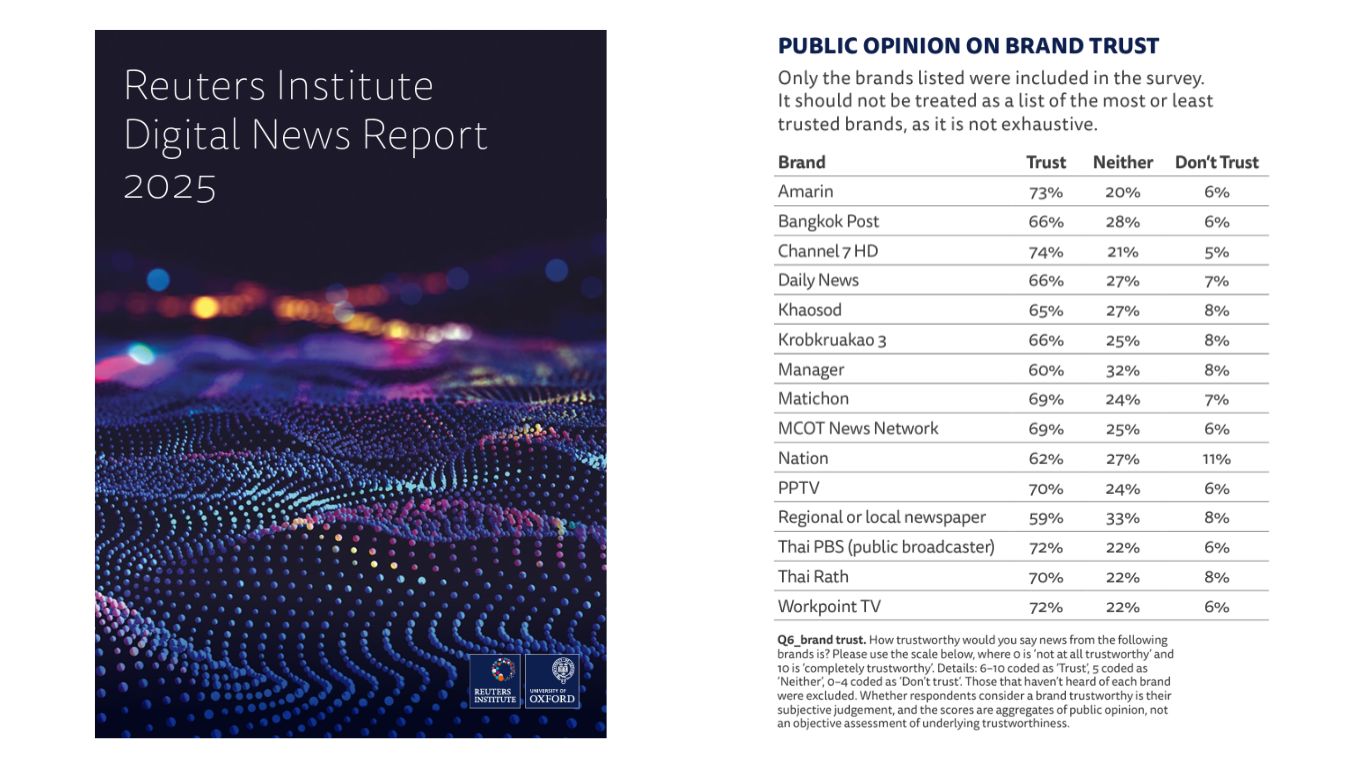 โดยข่าวจากสื่อหลักอย่าง ช่อง 7 HD (74%), Amarin (73%) และ Workpoint TV (72%) ยังคงได้รับความไว้วางใจในระดับสูง