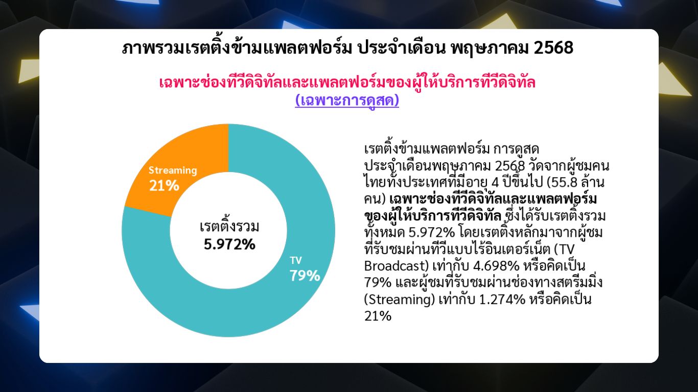 ในทางกลับกัน ภาพรวมเรตติ้งข้ามแพลตฟอร์ม ประจำเดือนพฤษภาคม 2568 ซึ่งเป็นเดือนแรกที่ Nielsen ใช้วิธีวัดเรตติ้งแบบใหม่ พบว่า สัดส่วนเรตติ้งหลักที่มาจากผู้ชมที่รับชมผ่านเครื่องเล่นทีวี (TV Broadcast) อยู่ที่ 79% ส่วนช่องทางสตรีมมิ่งที่นับเฉพาะแพลตฟอร์มของผู้ให้บริการทีวีดิจิทัล (เช่น MONOMAX, CH3 Plus, oneD) อยู่ที่ 21%