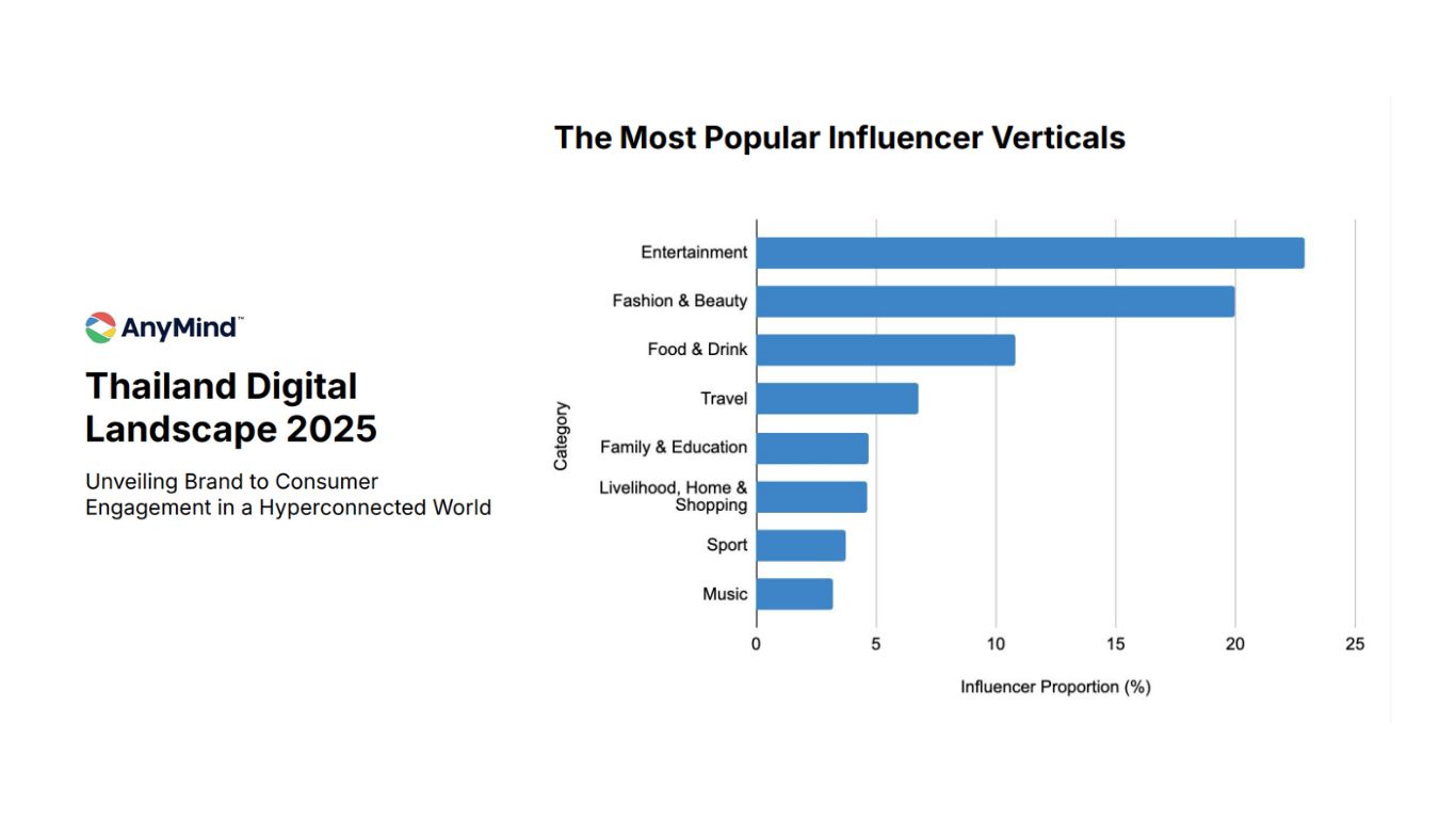 แม้จำนวนครีเอเตอร์จะเพิ่มขึ้นอย่างรวดเร็ว แต่โครงสร้างของตลาดอินฟลูเอนเซอร์ในแต่ละหมวดหมู่ยังคงใกล้เคียงเดิม รายงาน Thailand Digital Landscape 2025 ของ AnyMind Group ระบุว่า หมวดบันเทิงยังครองสัดส่วนอินฟลูเอนเซอร์สูงสุดที่ 35.3% ตามด้วยหมวดแฟชั่นและความงาม 20% และอาหารและเครื่องดื่ม 12%