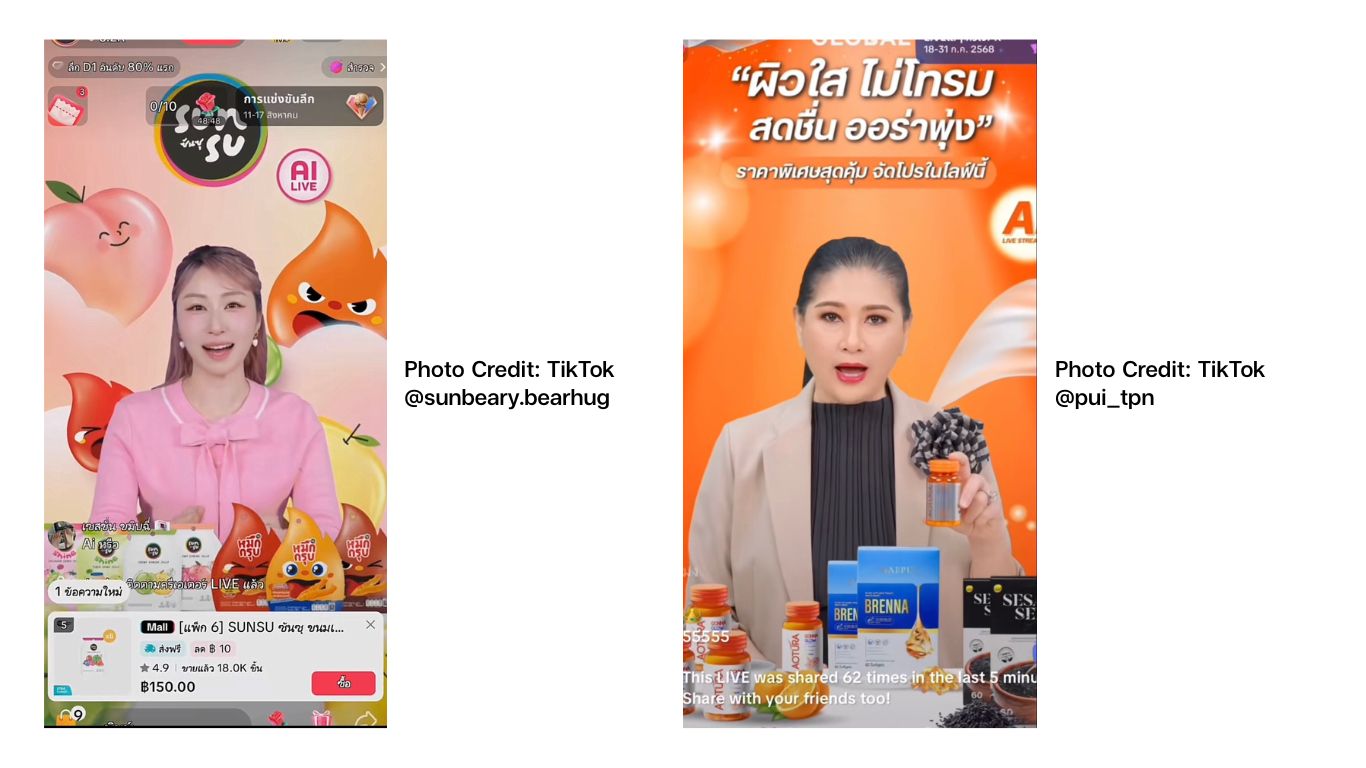 จากแนวโน้มดังกล่าว ครีเอเตอร์จำนวนมากเริ่มนำ AI มาประยุกต์ใช้งานมากขึ้น เช่น การสร้าง AI Avatar โคลนนิงตัวเองเพื่อไลฟ์ขายสินค้า ตัวอย่างเช่น คุณซาร์ตจากช่อง Bearhug (@sunbeary.bearhug) ที่ใช้ AI Avatar ไลฟ์ขายเยลลี่แบรนด์ซันซุและหมึกกรุบผ่านติ๊กต๊อก หรือ แม่ปุ้ย ปิยาภรณ์ แสนโกศิก (@pui_tpn) จากช่อง TPN Global ที่นำ AI Avatar มาไลฟ์ขายสินค้าของแบรนด์เช่นกัน
