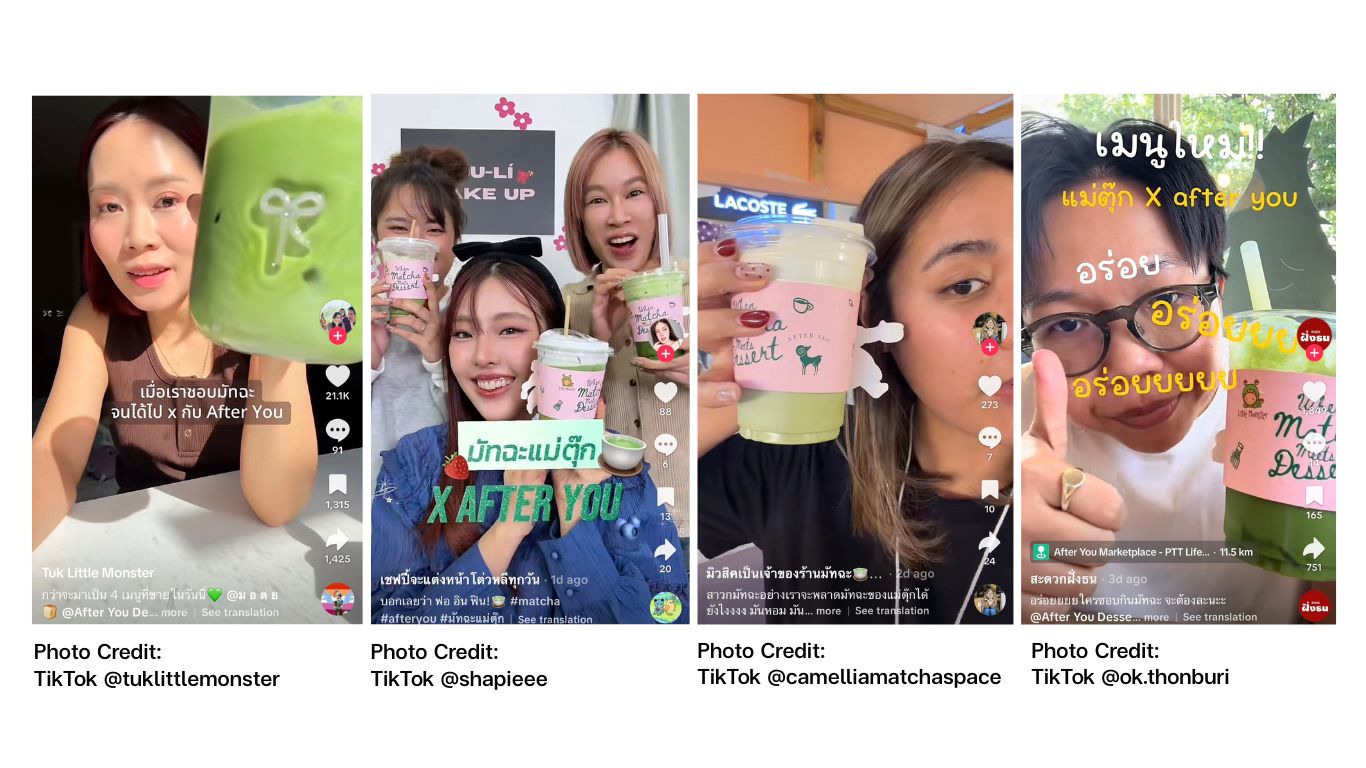 ตัวอย่างกรณีศึกษาที่น่าสนใจคือแบรนด์ After You ที่เลือกดึงคุณตุ๊กจากช่อง Little Monster (@tuklittlemonster) มาร่วมพัฒนาเมนูมัทฉะ ไม่ใช่เพราะเธอมีผู้ติดตามมากที่สุด แต่เพราะเธอสร้างคอนเทนต์เกี่ยวกับมัทฉะอย่างต่อเนื่องมานานหลายปี จนเกิดคอมมูนิตี้คนรักมัทฉะที่ติดตามและแลกเปลี่ยนความคิดเห็นกันอย่างสม่ำเสมอ