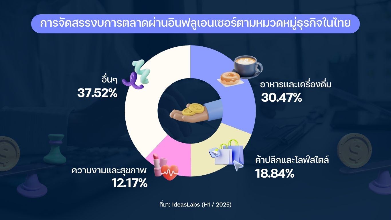 ในฝั่งดีมานด์ ข้อมูลจาก IdeasLabs พบว่า ในช่วงครึ่งแรกของปี 2568 อุตสาหกรรมที่ใช้งบการตลาดผ่านอินฟลูเอนเซอร์สูงสุด 3 อันดับแรก ได้แก่ อาหารและเครื่องดื่ม (30.47%) ค้าปลีกและไลฟ์สไตล์ (18.84%) และความงามและสุขภาพ (12.17%) รวมกันคิดเป็นกว่า 62% ของงบทั้งหมด สะท้อนภาพเดียวกันว่า กลุ่มอาหาร ความงาม และค้าปลีก–ไลฟ์สไตล์ ยังคงเป็นแรงขับเคลื่อนหลักของตลาดอินฟลูเอนเซอร์ไทย ทั้งในแง่จำนวนครีเอเตอร์และเม็ดเงินโฆษณา