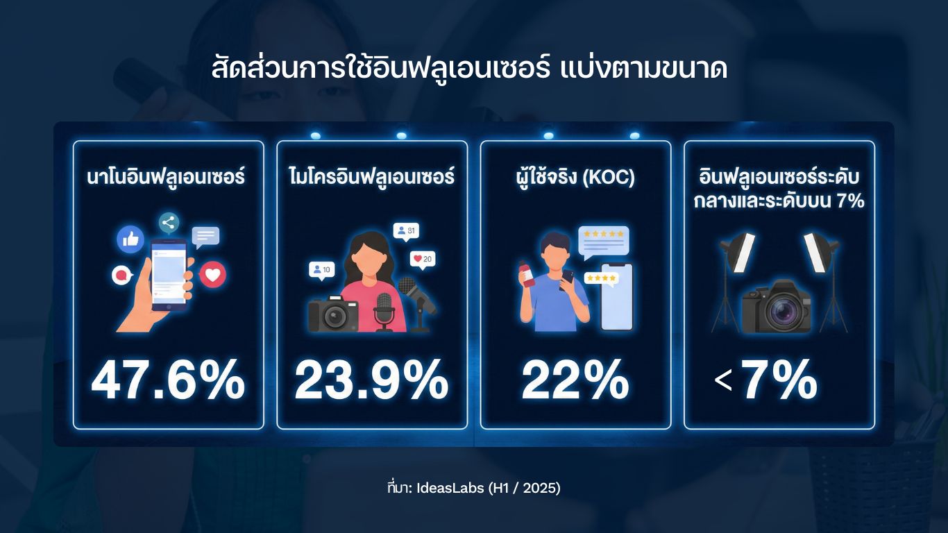 ข้อมูลจาก IdeasLabs ระบุว่านาโนอินฟลูเอนเซอร์ครองสัดส่วนตลาดสูงถึง 47.6% และไมโครอินฟลูเอนเซอร์ 23.9% รวมกันคิดเป็น 71.5% ขณะที่ผู้ใช้จริง 22% ส่วนกลุ่มอินฟลูเอนเซอร์ระดับกลางและระดับบนรวมกันไม่ถึง 7%