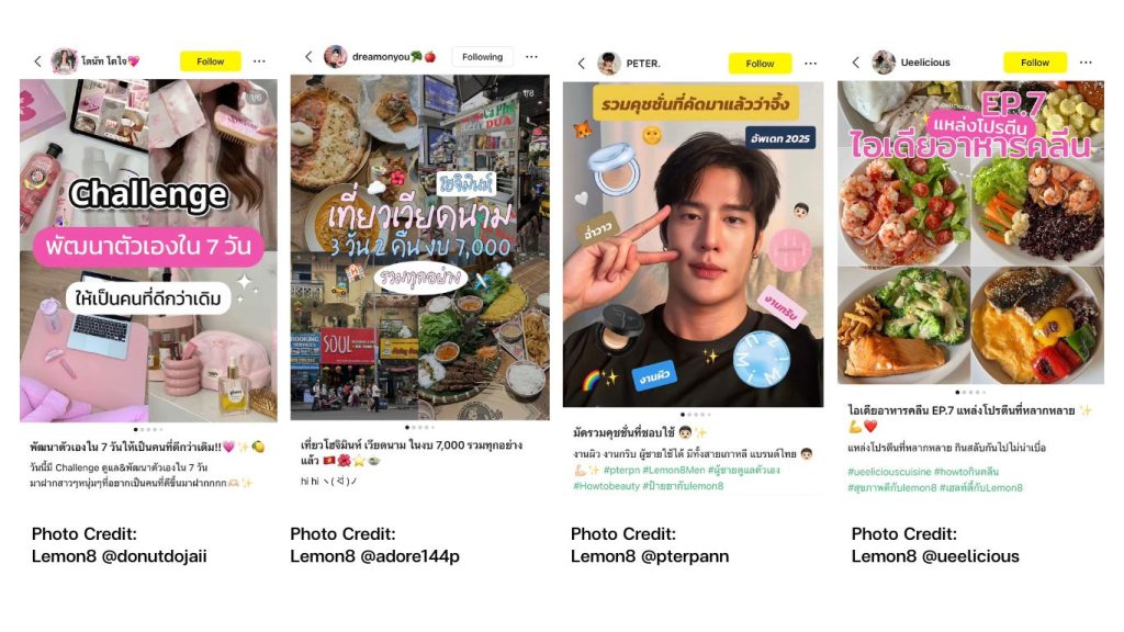 สิ่งที่ทำให้ Lemon 8 โดดเด่นคือการจัดหมวดหมู่คอนเทนต์ที่ชัดเจนและละเอียด ผู้ใช้งานสามารถเลือกสำรวจคอนเทนต์ตามความสนใจได้ทันที ไม่ว่าจะเป็นความงาม แฟชั่น อาหาร ท่องเที่ยว สุขภาพ การพัฒนาตัวเอง ไปจนถึงเทคโนโลยี โครงสร้างดังกล่าวทำให้แพลตฟอร์มกลายเป็นพื้นที่ของคอมมูนิตี้เฉพาะทาง และเปิดโอกาสให้แบรนด์เข้าถึงกลุ่มเป้าหมายได้ตรงจุดมากขึ้น