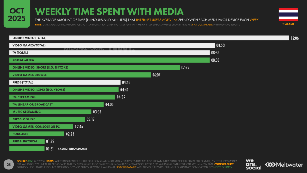 รายงาน Digital 2026: Thailand โดย We Are Social แสดงให้เห็นว่า 70.7% ของผู้ใช้อินเทอร์เน็ตไทยอายุ 16 ปีขึ้นไป รับชมวิดีโอผ่านแพลตฟอร์มสตรีมมิ่ง โดยใช้เวลาเฉลี่ย 4 ชั่วโมง 35 นาทีต่อสัปดาห์ และใช้จ่ายกับสตรีมมิ่งมากที่สุดถึง 33.2% ของการซื้อคอนเทนต์ออนไลน์ในแต่ละเดือน ตัวเลขเหล่านี้สะท้อนว่า สตรีมมิ่งได้กลายเป็นส่วนหนึ่งในชีวิตประจำวันของคนไทยไปแล้ว