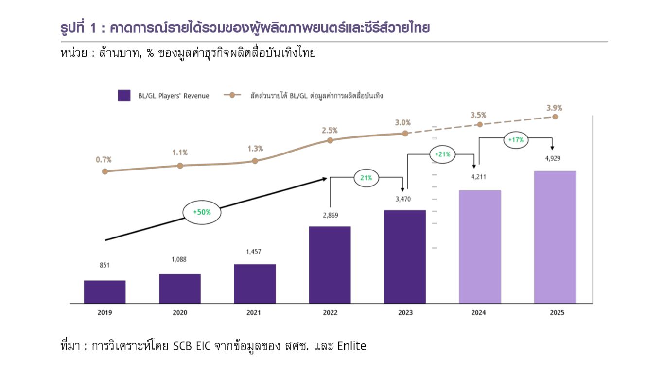 บทวิเคราะห์จาก SCB EIC ระบุว่า ที่ผ่านมารายได้รวมของผู้ผลิตภาพยนตร์และซีรีส์วายของไทยเติบโตแบบก้าวกระโดด และมีแนวโน้มขยายตัวต่อเนื่องราว 17% เมื่อเทียบกับปีก่อนหน้า คิดเป็นมูลค่ารวมมากกว่า 4,900 ล้านบาทในปี 2568