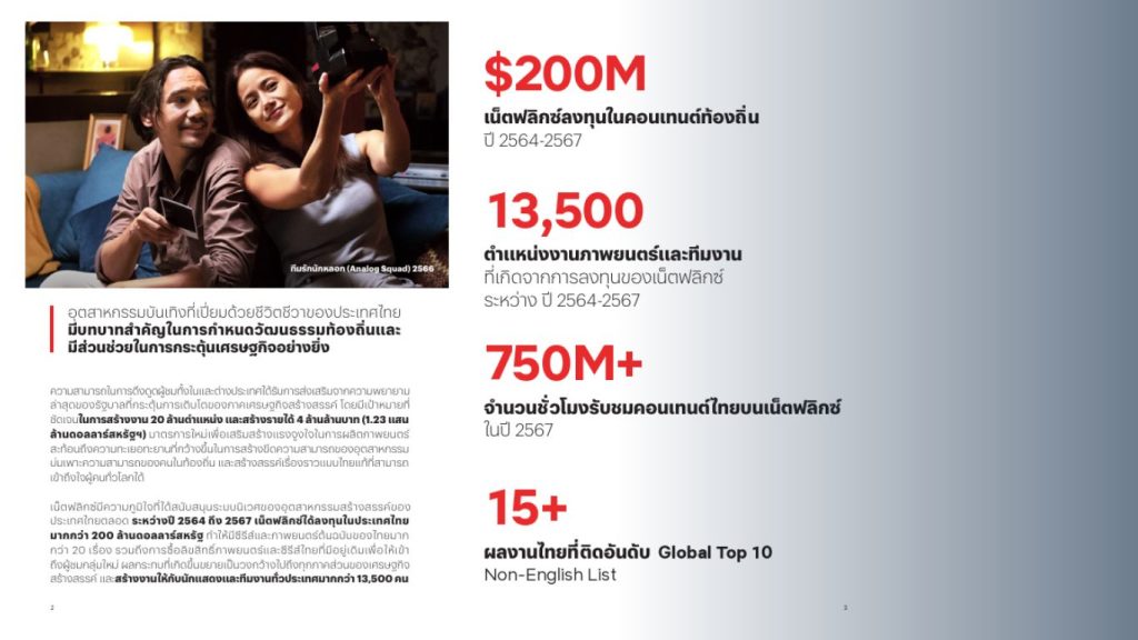 รายงาน “Netflix ในประเทศไทย: พลังขับเคลื่อนอนาคตจากการเล่าเรื่องท้องถิ่น” ระบุว่า ระหว่างปี 2564-2567 Netflix ได้ทุ่มงบลงทุนในคอนเทนต์ไทยรวมแล้ว 200 ล้านดอลลาร์สหรัฐ และประสบความสำเร็จอย่างสูงจนมีผลงานจากประเทศไทยมากกว่า 15 เรื่อง ที่สามารถทะยานขึ้นไปติดอันดับ Global Top 10 ในหมวดรายการภาษาต่างประเทศ (Non-English) เช่น สืบสันดาน (Master of the House) ในปี 2567 และ สงครามส่งด่วน (Mad Unicorn) ในปี 2568 โดยมียอดชั่วโมงการรับชมคอนเทนต์ไทยบน Netflix รวมสูงถึง 750 ล้านชั่วโมง