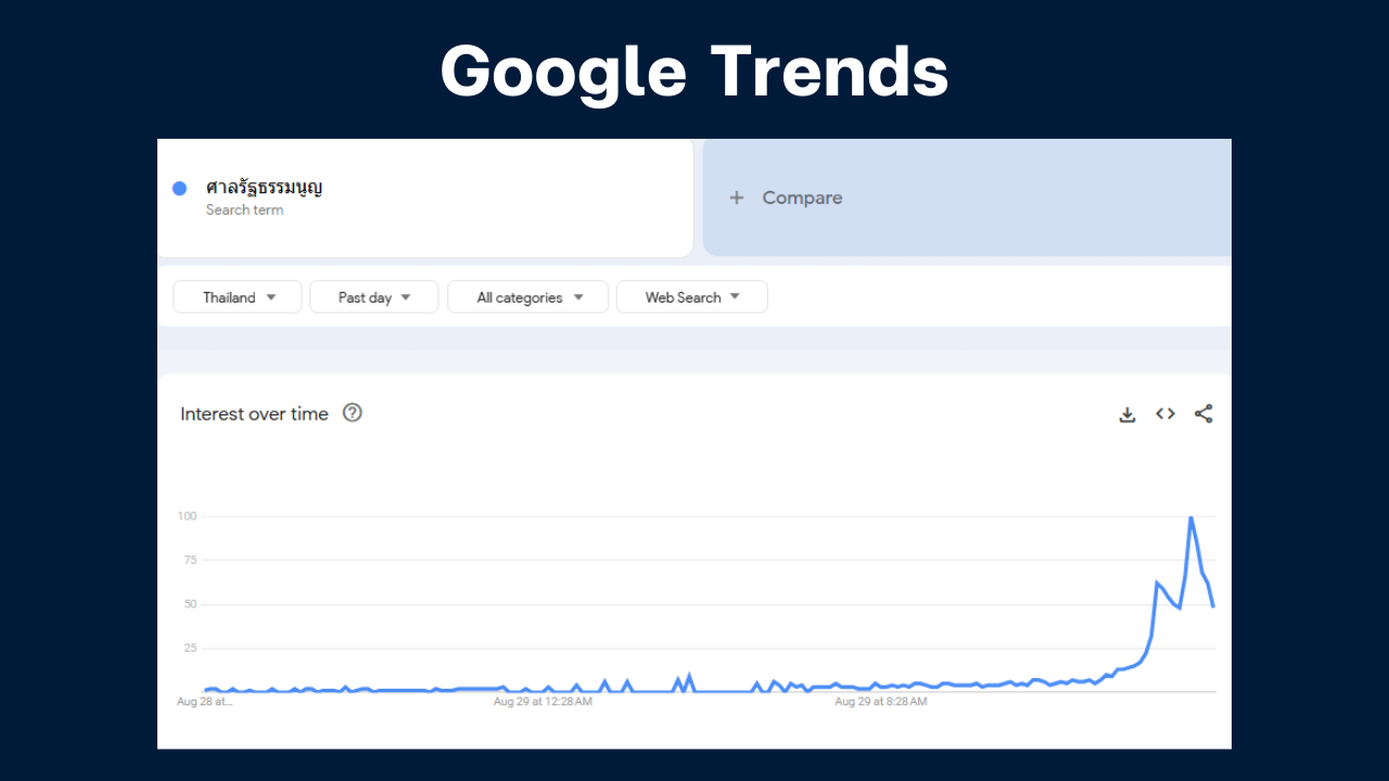 ข้อมูลจาก Google Trends แสดงให้เห็นว่าคำค้นหา “ศาลรัฐธรรมนูญ” มีความนิยมเพิ่มขึ้นอย่างรวดเร็วในช่วง 24 ชั่วโมงที่ผ่านมา โดยเฉพาะในวันนี้ (29 ส.ค.) ความสนใจของประชาชนสูงขึ้นถึงระดับสูงสุดที่ 100 หลังจากที่อยู่ในระดับต่ำประมาณ 10-15 ตลอดช่วงเดือนที่ผ่านมา