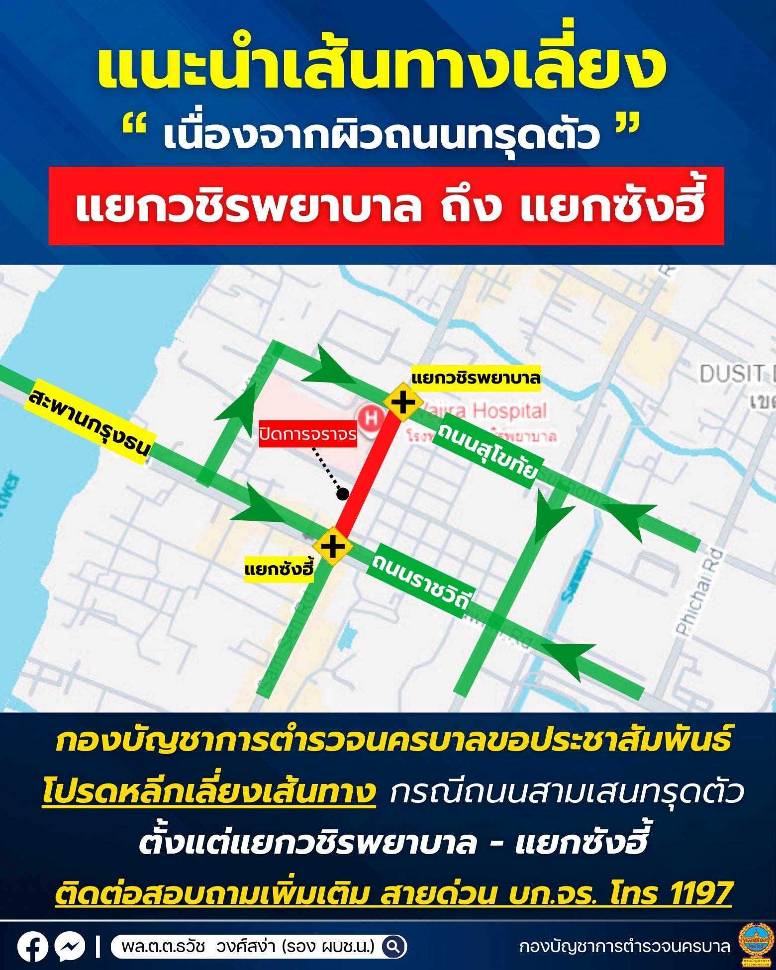 ขณะนี้มีการปิดการจราจรตั้งแต่แยกวชิรพยาบาลถึงแยกซังฮี้ หน่วยงานที่เกี่ยวข้องอยู่ระหว่างเร่งแก้ไข ขอความร่วมมือผู้ใช้รถใช้เส้นทางหลีกเลี่ยงพื้นที่ใกล้เคียง