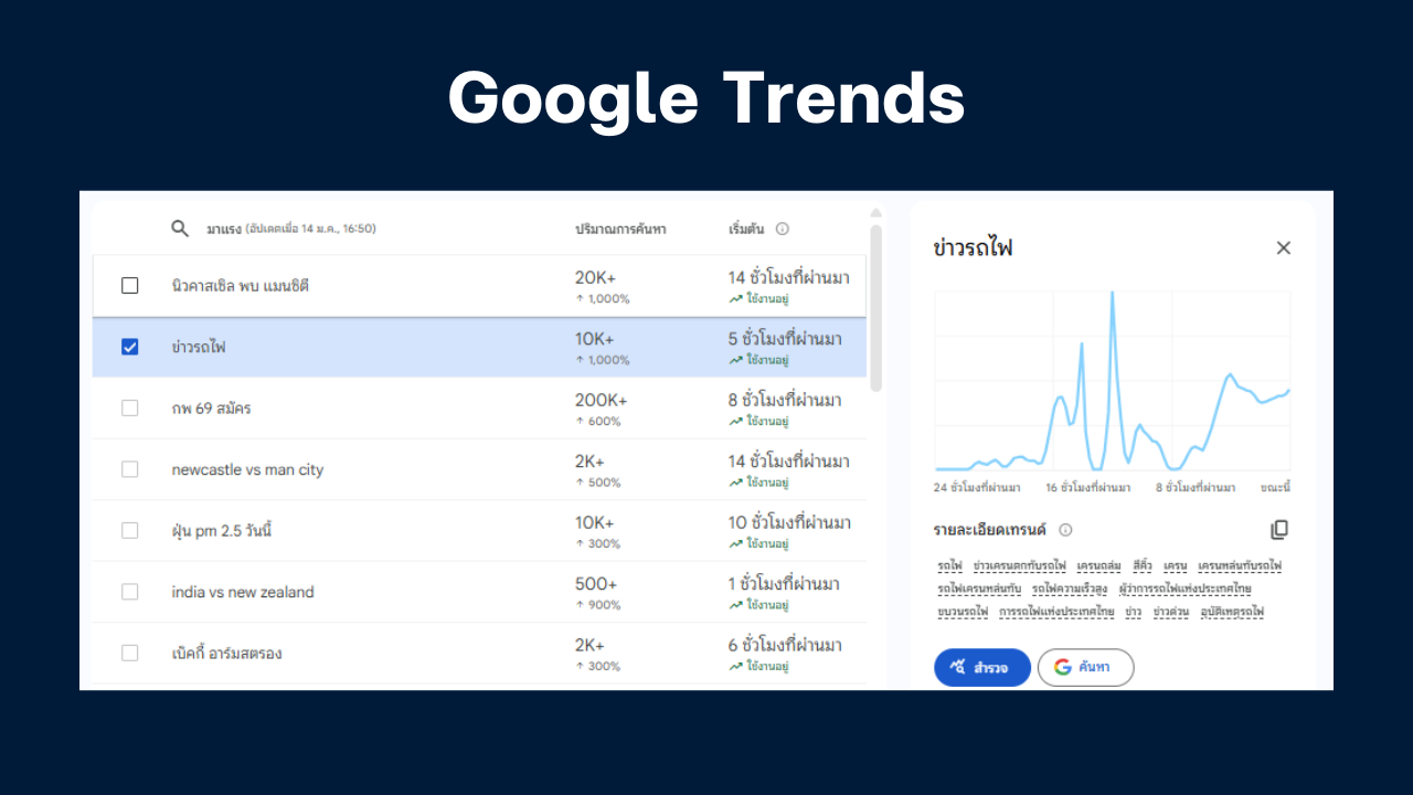 เหตุการณ์ดังกล่าวถูกเผยแพร่ผ่านภาพและคลิปวิดีโอจากพื้นที่เกิดเหตุบนหลายแพลตฟอร์มโซเชียล ขณะที่คำค้นหา “ข่าวรถไฟ” มีปริมาณการค้นหาบน google กว่า 10,000 ครั้ง ภายในเวลา 5 ชั่วโมง สะท้อนความสนใจของประชาชนที่เฝ้าติดตามสถานการณ์อย่างใกล้ชิด
